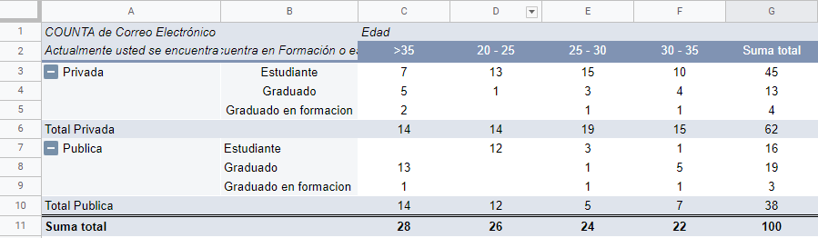 De los encuestados del rango entre 20 y 25 años, 12 refirieron estudiar en universidad pública y 14 en universidad privada, de los cuales se encontró 25 estudiantes y 1 graduado, el rango entre 25 y 30 años, 5 refirieron estudiar en universidad pública y 19 en universidad privada, de los cuales se encontró 25 estudiantes, 4 graduados y 2 graduados en formación, el rango entre 30 y 35 años, 7 refirieron estudiar en universidad pública y 15 en universidad privada, dentro de los cuales se encontró 11 estudiantes, 9 graduados, y 2 graduado en formación, y el rango mayor a 35 años, 14 estudiaron en universidad pública y 14 en universidad privada, dentro de los cuales se encontró 7 estudiantes, 18 graduados, y 3 graduados en formación (figura 1).