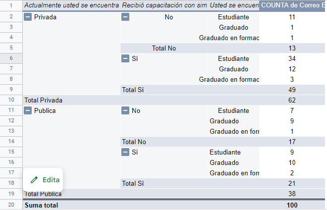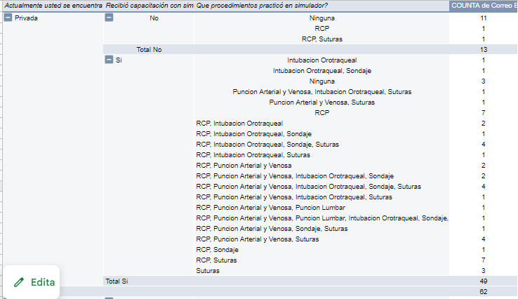 Se analizaron las siguientes variables: número de estudiantes, graduados, y graduados en formación, cantidad de encuestados según casa de estudio (publica o privado), participantes que se capacitaron en simulador, resultados de participantes al realizar el primer procedimiento al paciente, emoción sentida al realizar procedimiento al paciente, y resultado del procedimiento al haberse capacitado o no con simulador.