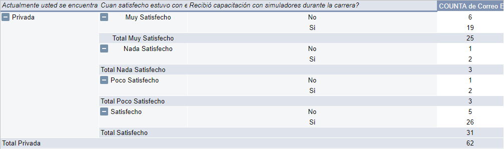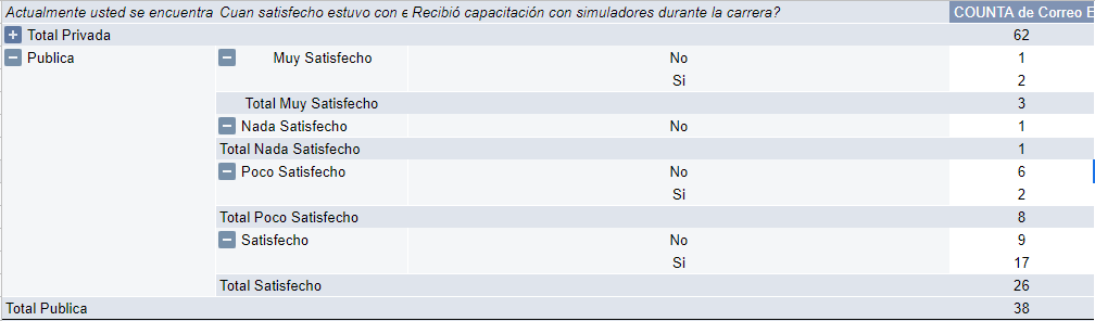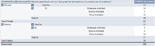 Respecto a la actividad en simuladores, la muestra encuestada refirió que las 62 personas que estudiaron en universidad privada, 13 personas (21,7 %) no recibieron actividad en simulador, mientras que 49 personas, (79,3 %) recibieron actividad en simulador.