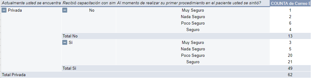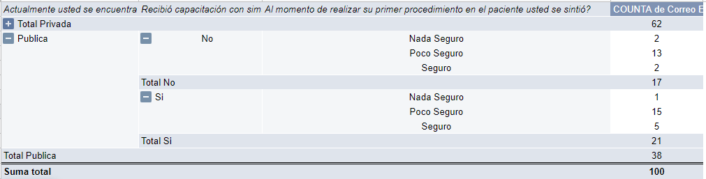 Al momento de realizar el primer procedimiento al paciente, quienes estudiaron en universidad pública y no recibieron capacitación en simulador, 2 refirieron sentirse nada seguros al momento de realizar el mismo, 13 refirieron sentirse poco seguros, y los últimos 2 refirieron sentirse seguros al momento de realizar el procedimiento al paciente.