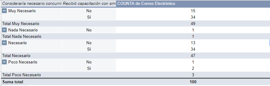 Continuando con la encuesta, se le pregunto a los encuestados sobre la necesidad de concurrir esporádicamente a simuladores para reforzar los conocimientos, de un total de 100 personas, 70 de ellos que recibieron capacitación con simulador refirieron, 34 que era muy necesario, otros 34 que era necesario, y 2 poco necesario.