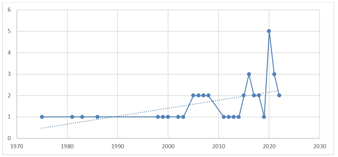 A total of 41 research studies were retrieved. 2020 had the highest number of investigations (5 articles for 12,19 %). Followed by 2016 and 2021 with three researches each (7,31 %) (figure 1).