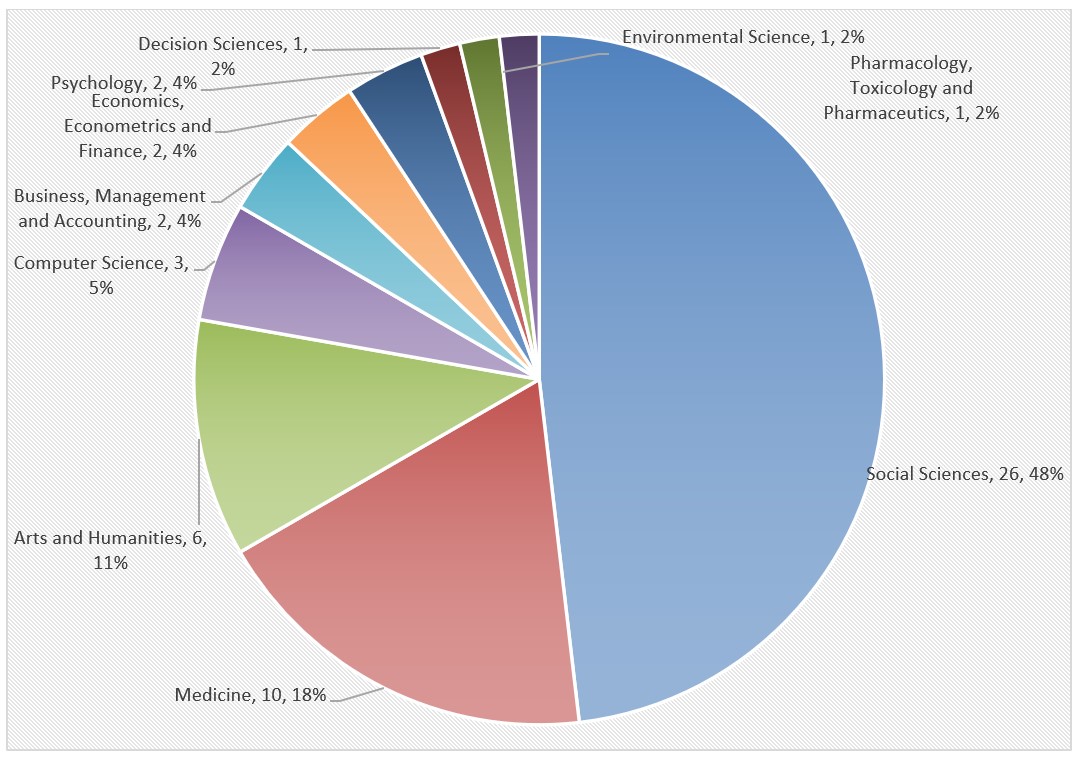 Research related to the social sciences stood out (26 papers; 48 %). Similarly, there was evidence of a relationship with other areas of knowledge: medicine (10 types of research; 18 %) and arts and humanities (6 types of research; 11 %) (figure 2).
